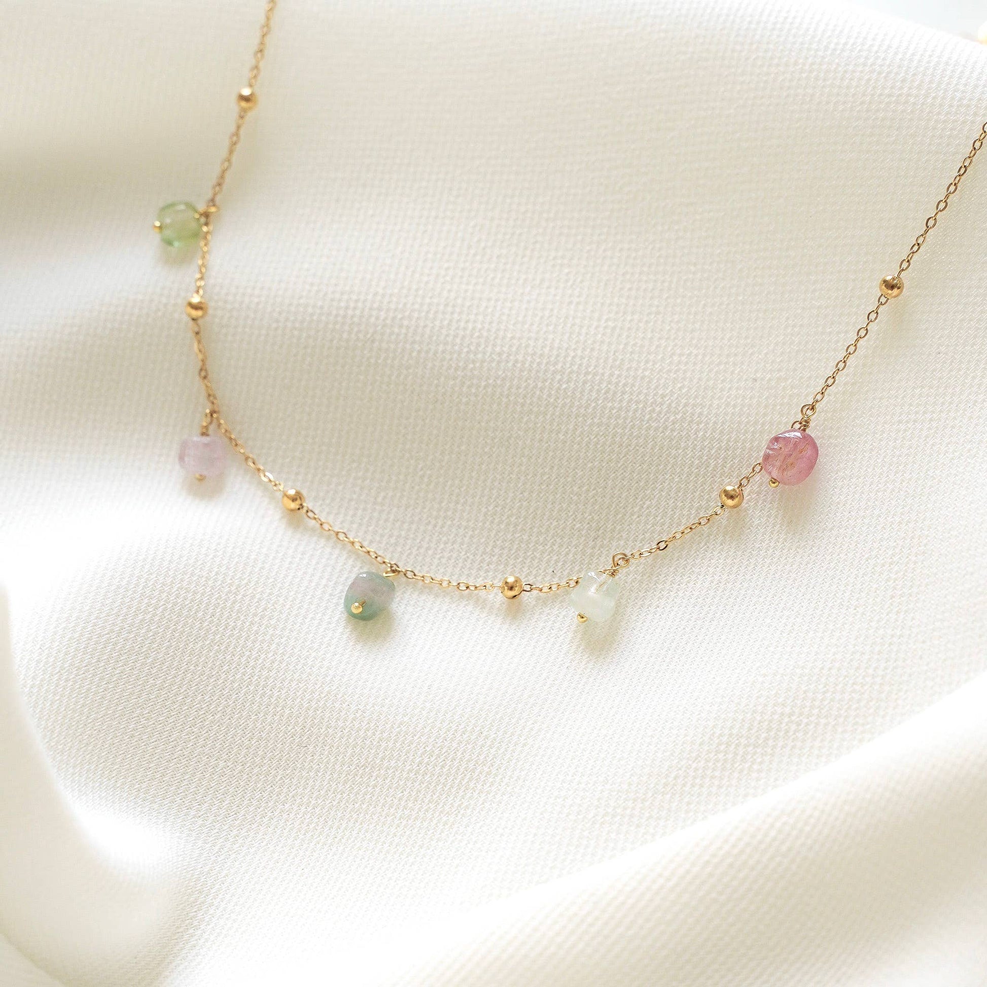 Ce délicat collier pour femme en acier inoxydable est orné de petits pendentifs en tourmaline naturelle et se porte près du cou. La simplicité des pierres naturelles confère à ce collier une élégance discrète : minimaliste et intemporelle, elle en fait un cadeau idéal. Chaque collier étant unique, sa couleur peut légèrement varier.