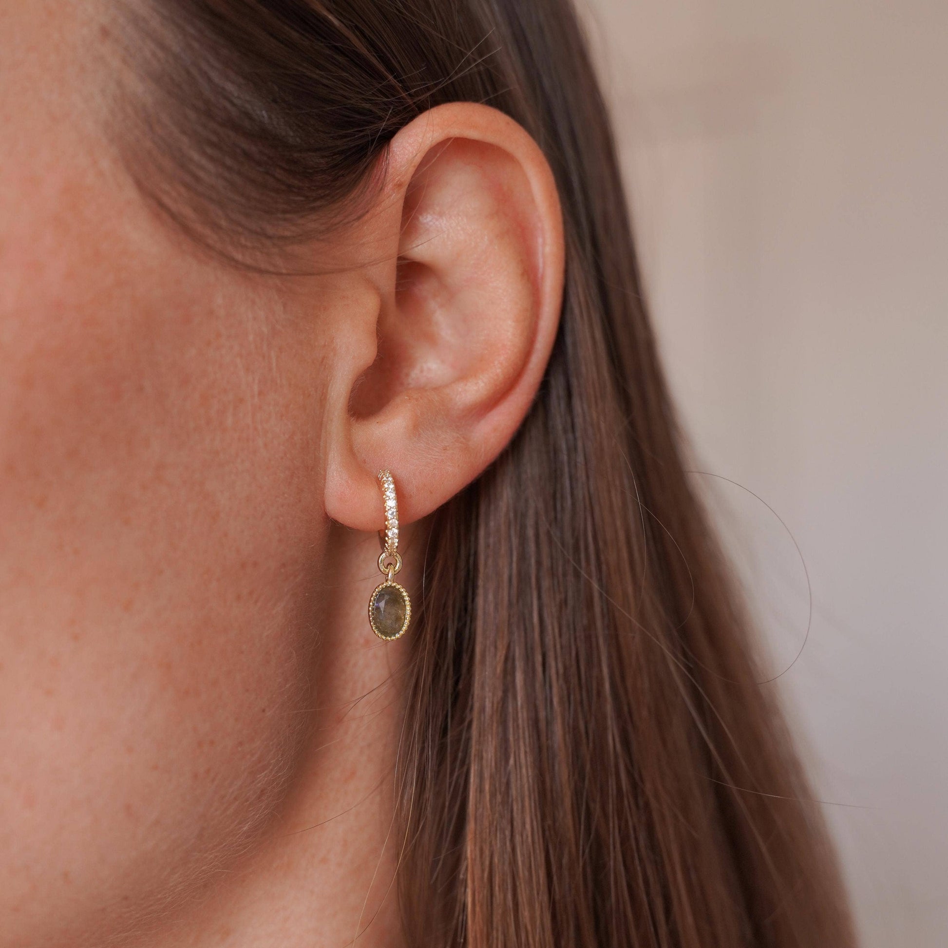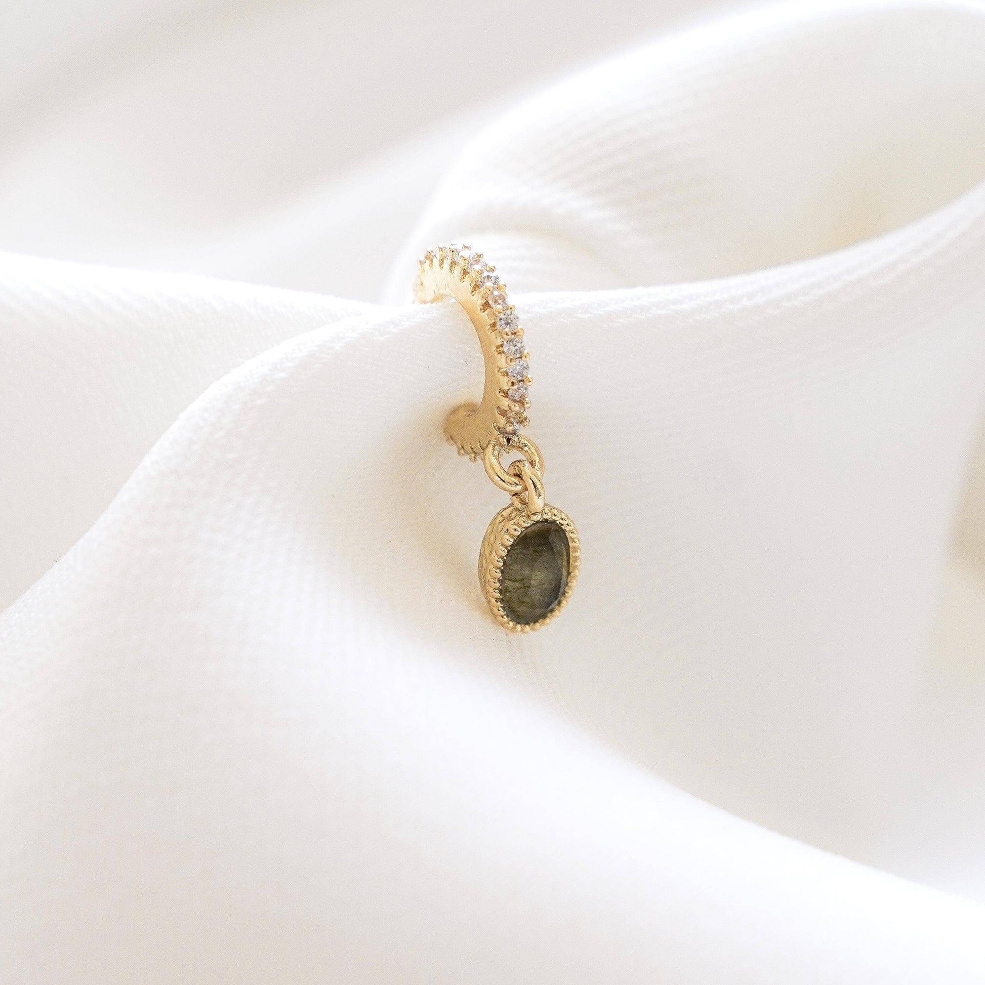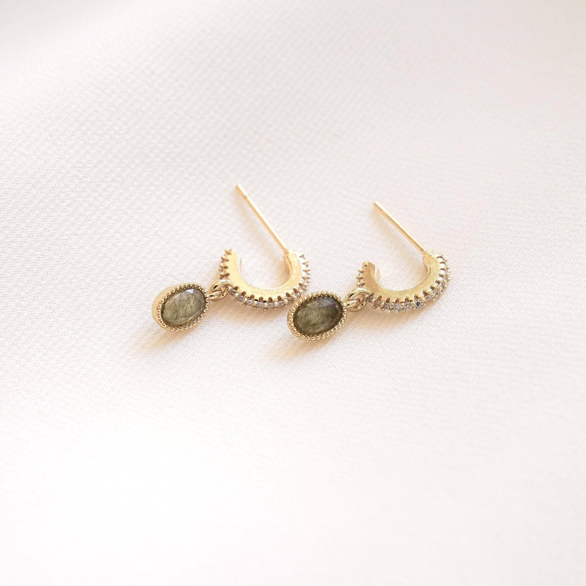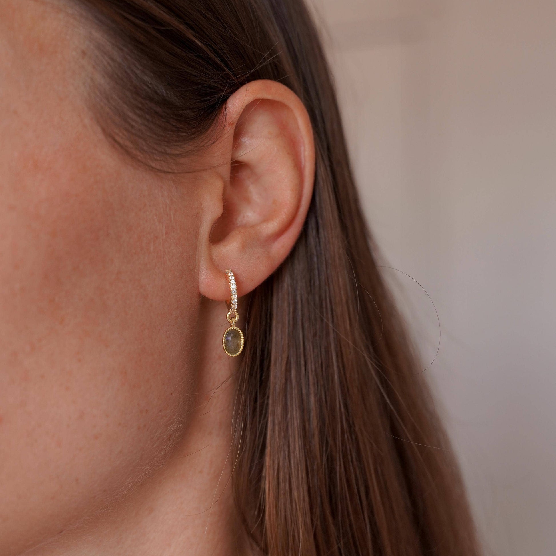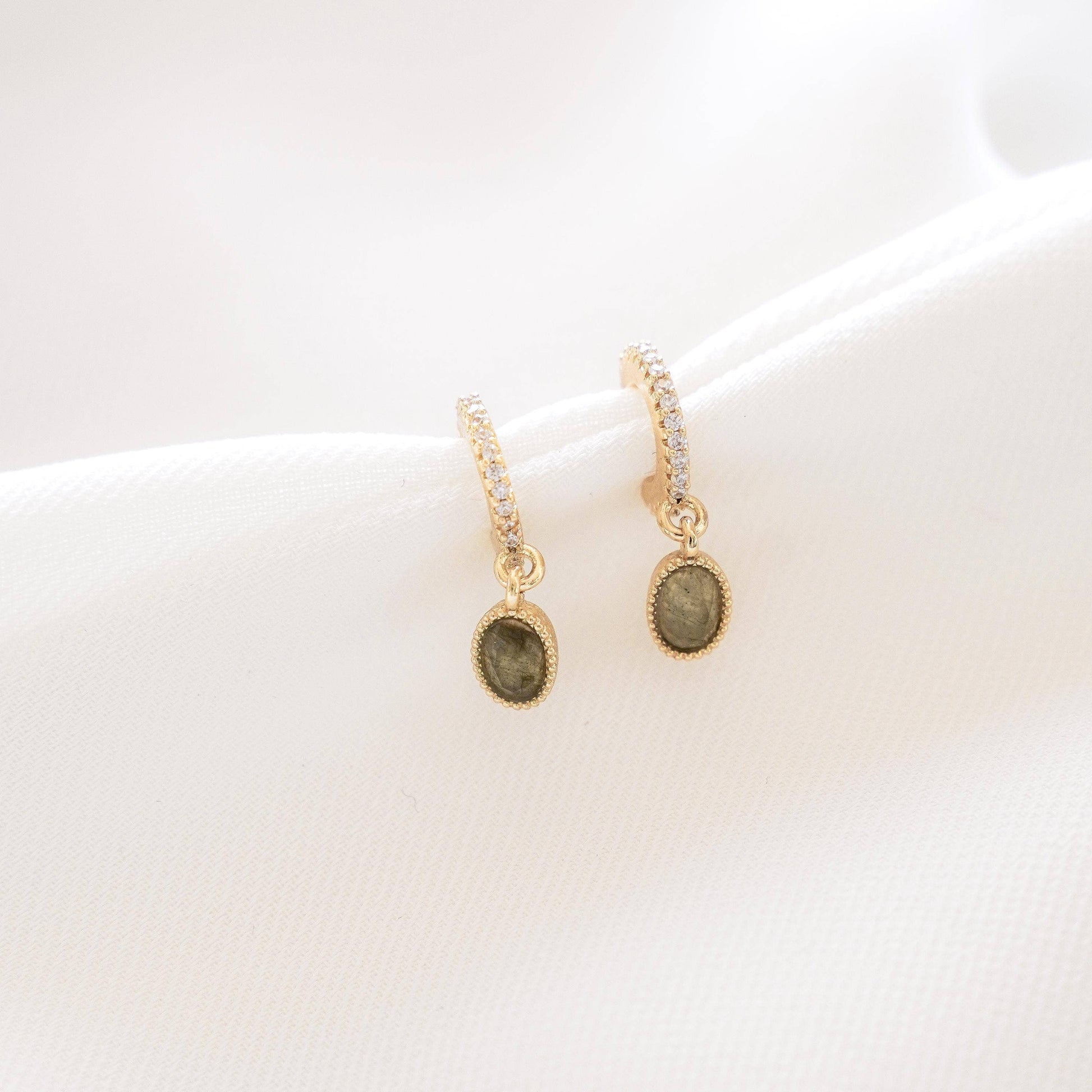 Diese modernen, minimalistischen Edelstahl-Ohrringe kombinieren einen feinen grauen Edelstein – Labradorit – mit kleinen funkelnden Zirkonia-Steinen am Creolenring. Der dezente Schimmer des Labradorits harmoniert perfekt mit dem eleganten Glanz der Creole und macht die Ohrringe zu einem vielseitigen Begleiter – tagsüber ebenso wie am Abend.